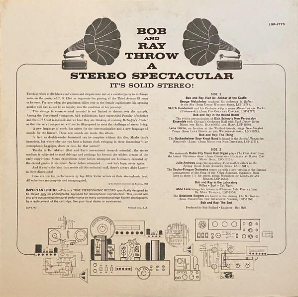 For those of you who don’t know it the album is comprised of a group of selections taken from the best of the early Living Stereo releases, some of which obviously sound better than others, all interspersed with hilarious dialogue and sound effects by Bob and Ray. This record is a blast. The entertainment value is off the scale.