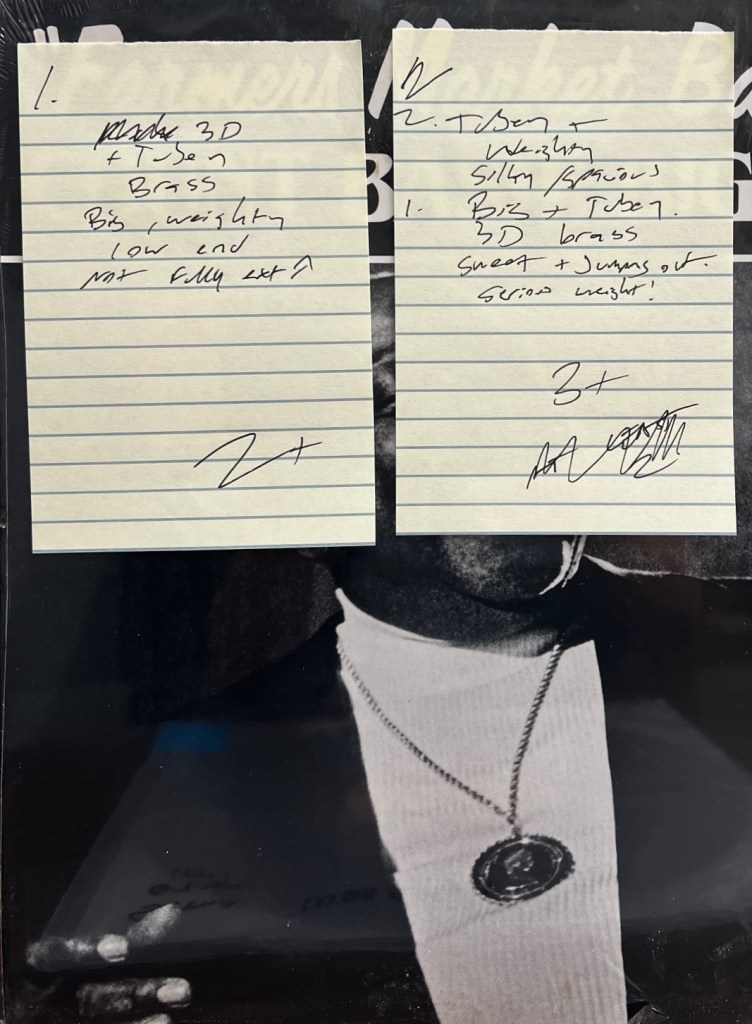 Let’s return to Riley’s notes. 99 times out of a hundred these notes will not be seen by anyone other than me and other members of the staff. The notes he wrote, the qualities of the sound he described, give away the game entirely.