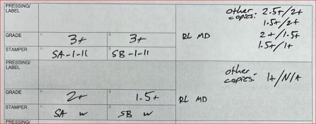 The most likely sound for any copy you might have is “good, not great,” because only two copies earned grades of 2+ or better on both sides. Two out of seven. (Which is disappointing because it hurts our bottom line when so few copies in a shootout will end up selling for much more than we invested in them in money and labor.)
