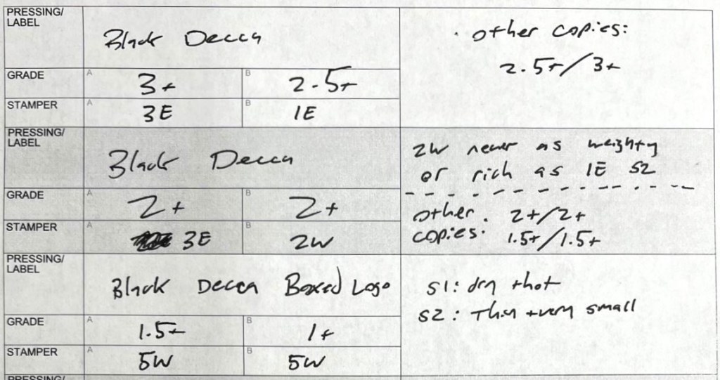 If we played nothing but 3E/1E originals, most of those 1E side twos would have earned a 2+ grade, but they would have sounded much better than the 2W-graded copies, and that seriously screws up the grading scale, especially when clean originals cost us a hundred bucks or more these days.