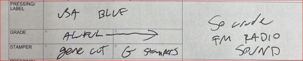 Allow us to add one more to that group of pressings to avoid, the blue vinyl domestic pressings mastered by Gene Thompson. Based on how awful this pressings sounds, it would probably be wise to avoid his work in general.