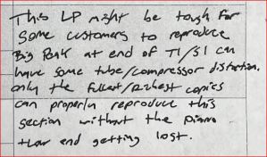 This LP might be tough for some customers to reproduce. The big peak at the end of track one on side one can have some tube/compressor distortion. Only the fullest, richest copies can properly reproduce this section without the piano and low end getting lost.