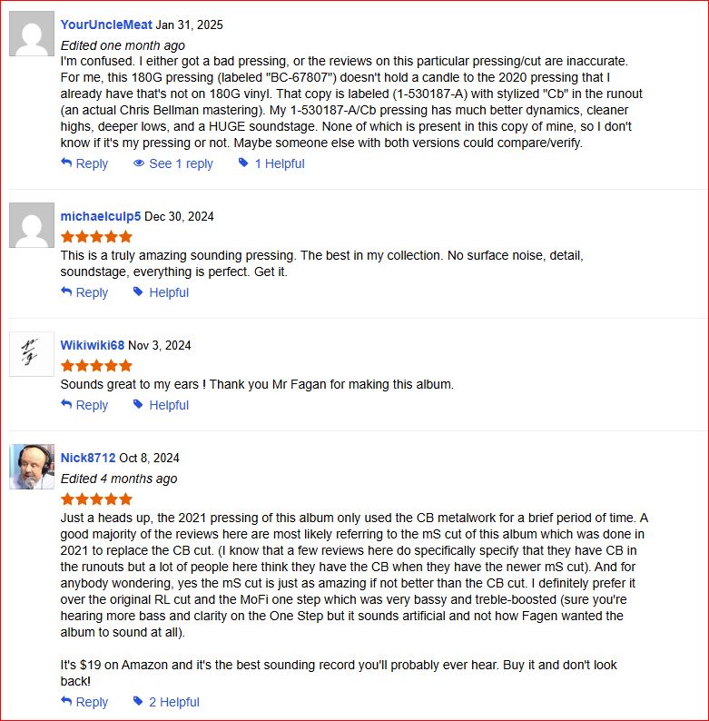 Note that the person doing the listening confined himself to what the record was doing right. In the case of this Shootout Winning Top Shelf 3/3 pressing, there really wasn’t any aspect of the sound to find fault with. As far as we were concerned, the record was doing what the record was trying to do, and doing it better than any of the other copies we played, hence the high grades.