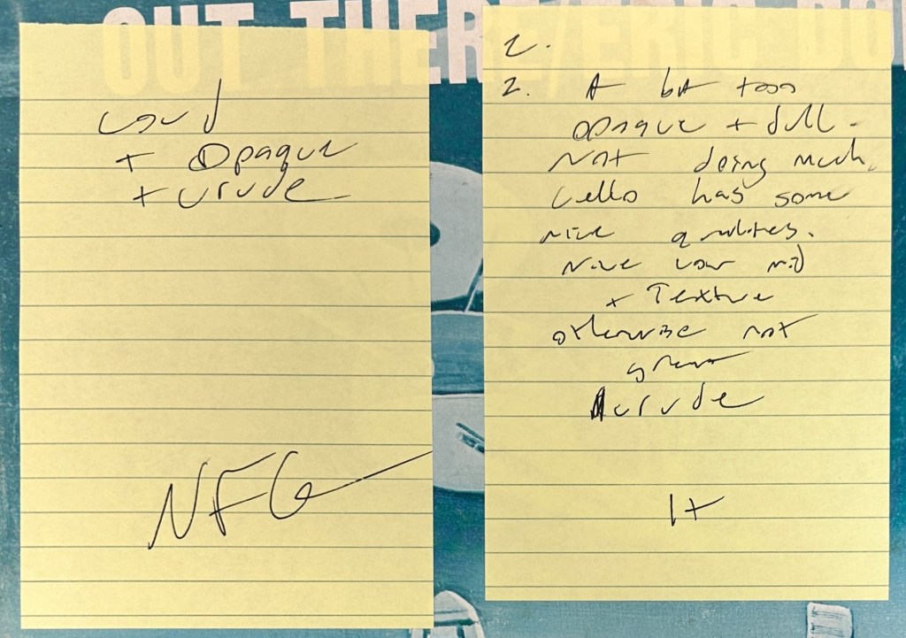 None of the Rudy Van Gelder cuttings we played of Eric Dolphy’s 1961 release of Out There were better than passable, and some had sides that were downright awful sounding, as you can plainly see from our notes.