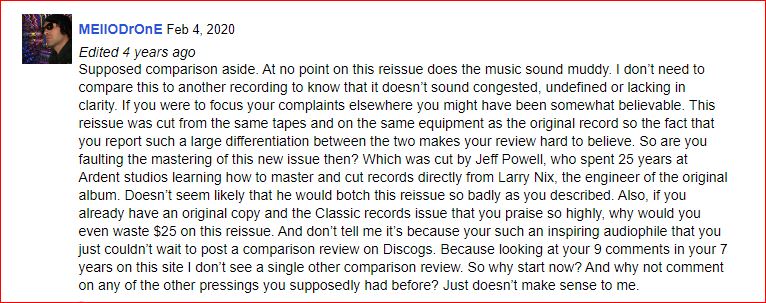 This record, The Dude be damned, is one of my all time favorites. It’s a delicious recording on even a decent copy. My current copy, which bested several others, was competitive on side 1, but laid to waste by the White Hot on side 2. And that was the side I thought mine had nailed!