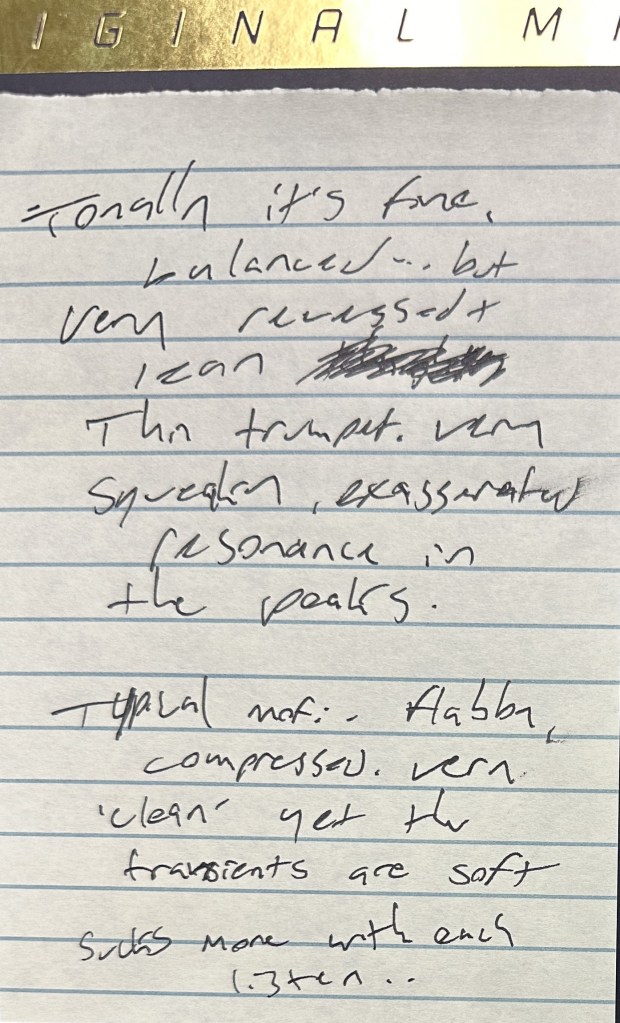 It was clear, forward, and dynamic. Nothing harsh, even in the horns, but so much more engaging and rich than I was used to. It was the drum solo partway through the first track that convinced me I was hearing something special in this pressing. I sat and listened to the entire record without doing anything else, and for me, something that holds my attention to where I don’t want to grab my phone or a book is part of what defines a peak listening experience.