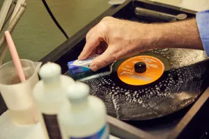 - Place the now dry record on a basic turntable, set at 45 RPM, and drop the needed on the first track. This will “plow” out any softened material that may be left in the grooves.
